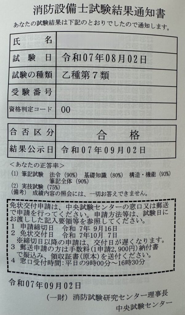 消防設備士 乙種7類の試験に合格しました!